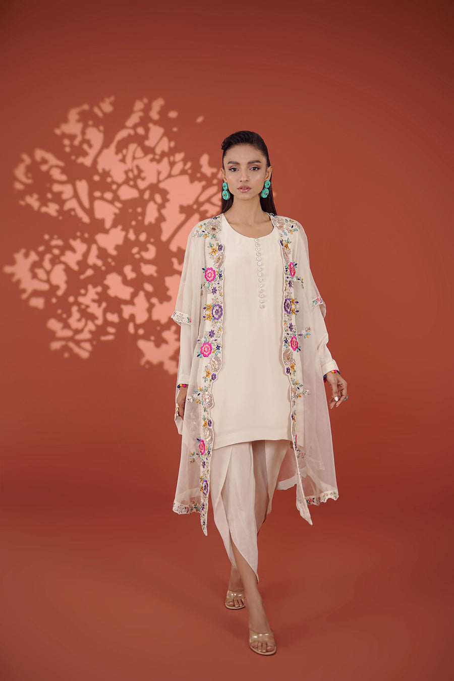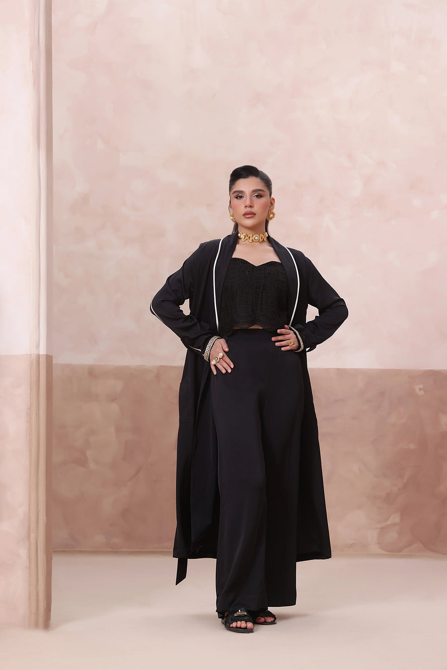 Midnight black with a hint of shine – Noir Whisper pairs a crisp, boxy kurta with a roomy shalwar for an easy, styled set. Playful in mood and precise in finish, it’s built for nights that call for a little...