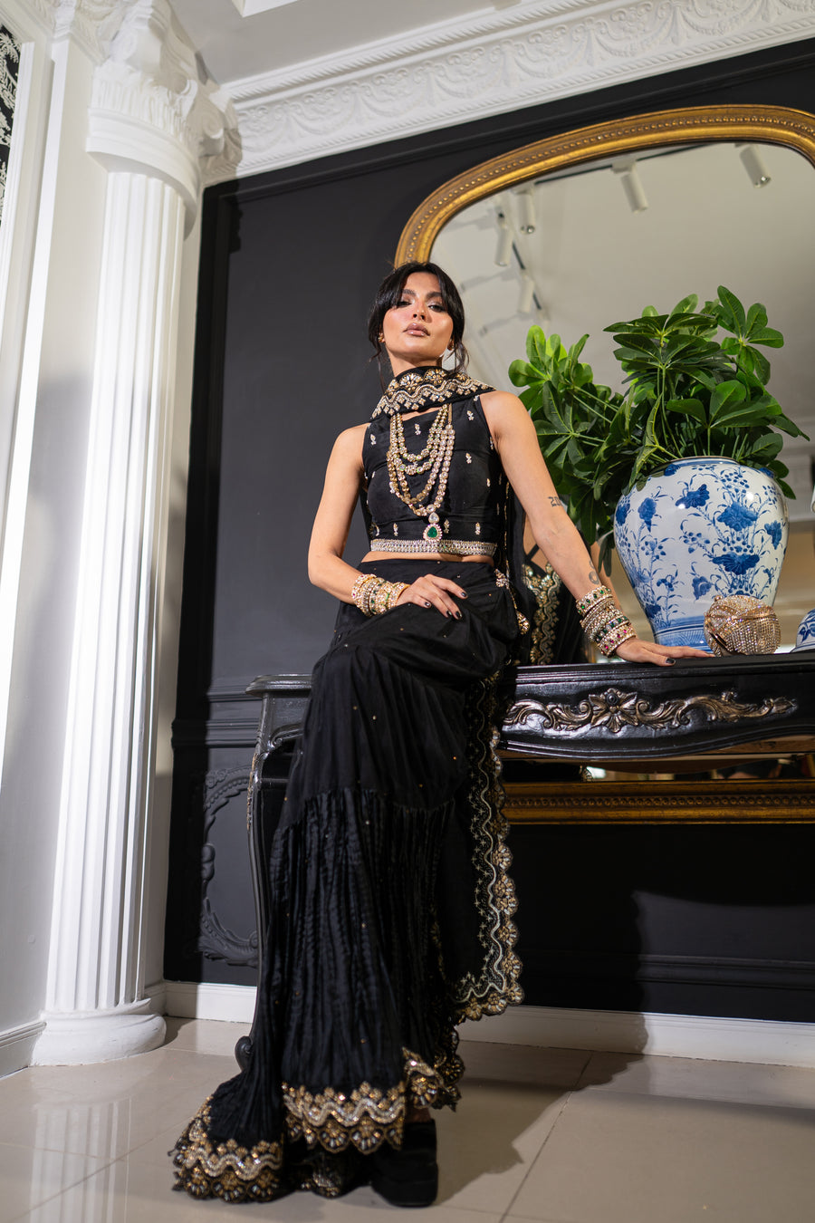 The one that captures all eyes as it walks in - Starstruck Royale is a masterclass in layers jet black with sequins, floral motifs, and intricate embroidery that catches every flicker of light. The shirt is sheer-sleeved with statement cuffs,...